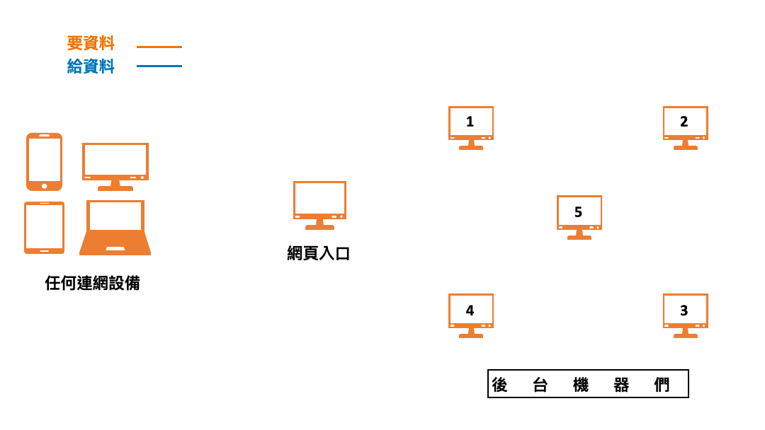 - 後台的五台機器們,就是俗稱的內網(區域網路),可以看流程圖上五台機器間之間的連結就像一張網,而外網(公用網路),就是各種開放給外部使用服務的組成,內網加上外網,則形成我們所熟知的網路